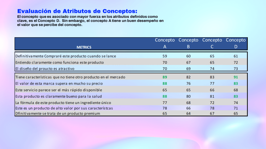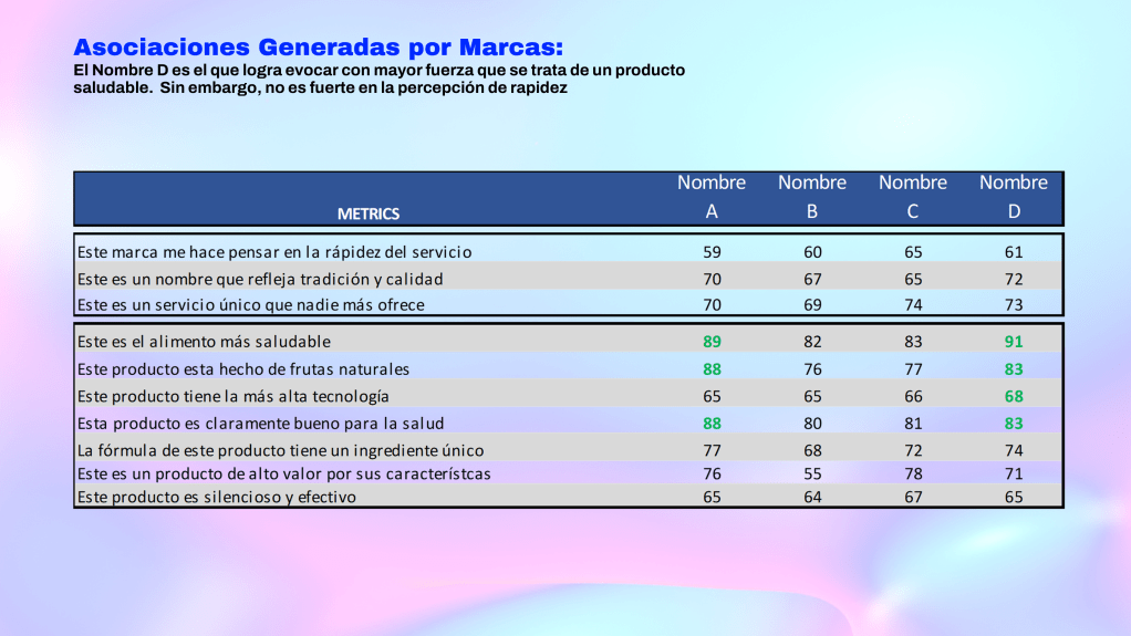 Es posible incluir conceptos y marcas de competidores, de manera que es posible comparar directamente las asociaciones que genera.