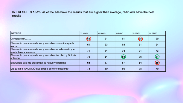Los resultados obtenidos mediante la metodología de IRT (Tiempo de Respuesta Implícito) mostraran la claridad con la que transmites tus mensajes clave a tu audiencia objetivo.